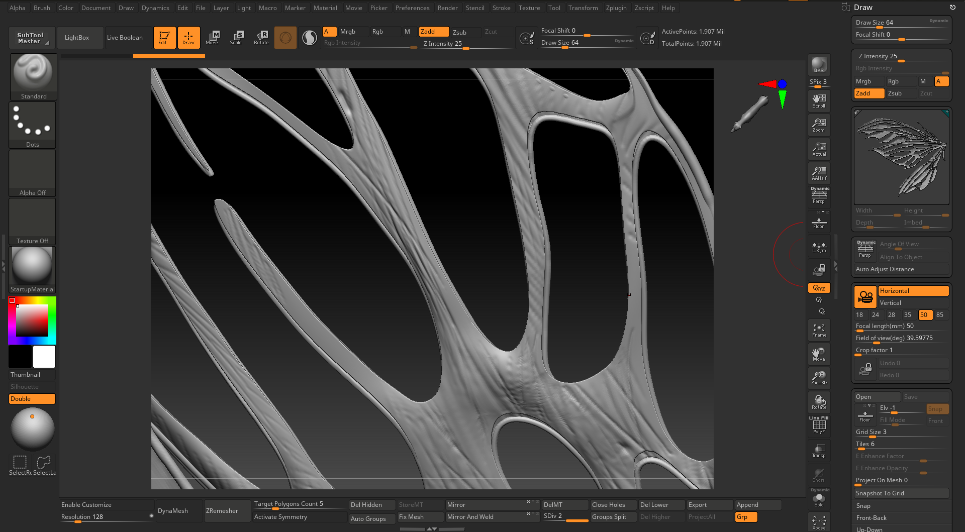 ZBrush is amazing! I use it to add micro details to the high-poly mesh if needed. In this case, the wings needed an additional level of detail that is well beyond what could be created using polygons.